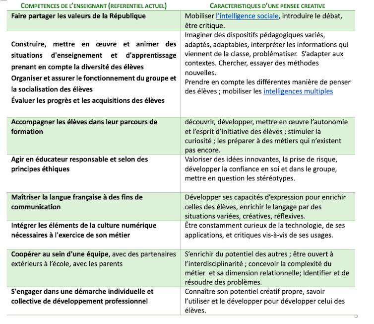 La créativité apparaît non seulement comme un fondement du métier, mais aussi comme une ressource pour les enseignants et par conséquent pour leurs élèves. Les projets de référentiel pour la formation des enseignants évoquaient la nécessité de consacrer 15 % du temps de formation initiale à la créativité et à la réflexivité, deux dispositions totalement liées.