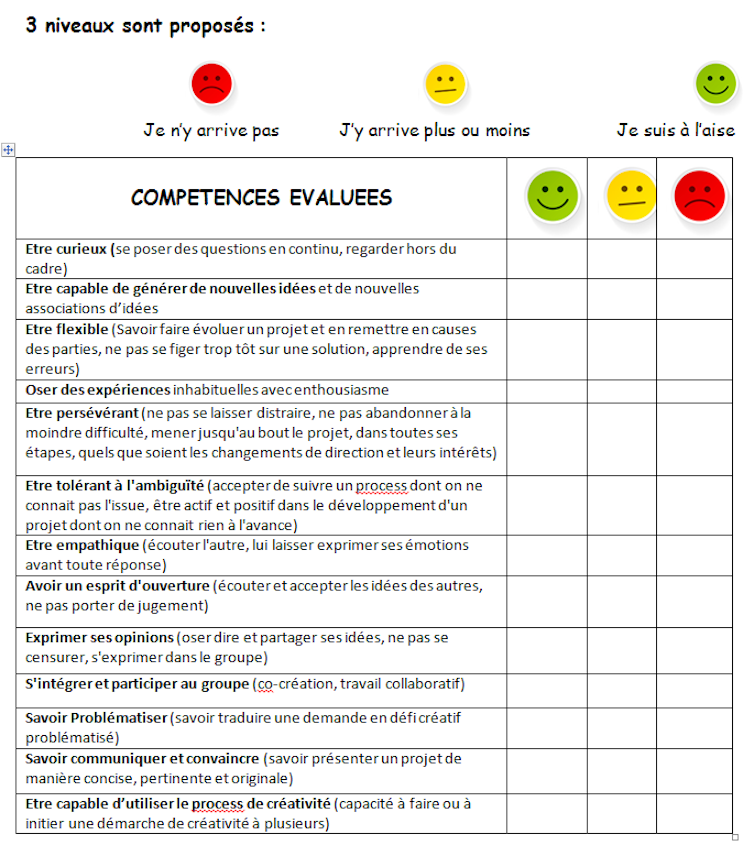 Dans le cadre d’un projet IDEFI Promising, nous avons développé une grille d’évaluation des compétences créatives. Basée sur les travaux de Véronique Dethier sur le tableau de bord des compétences créatives, cette grille comporte 13 compétences avec trois niveaux d’évaluation.