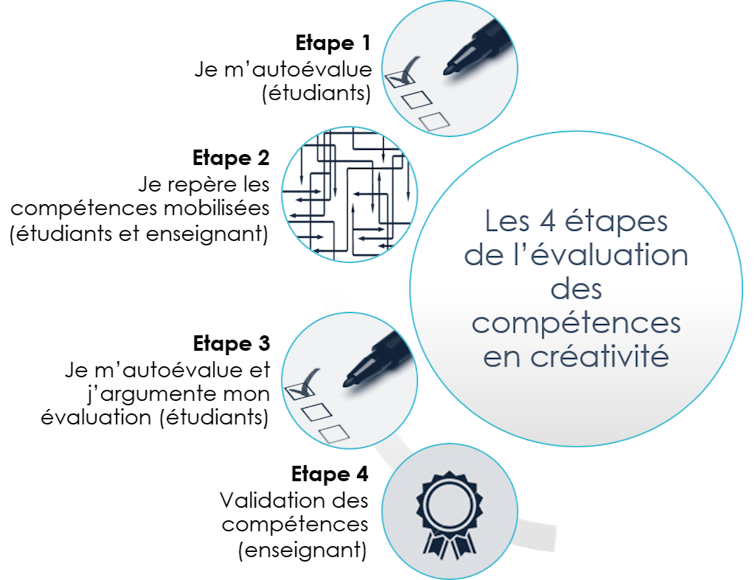 Avant de démarrer l’atelier, les étudiants ont fait le point sur leurs compétences créatives au moyen de la grille d’évaluation. À la fin de l’atelier, ils se sont autoévalués sur chacune des compétences créatives de cette même grille tout en les argumentant. L’enseignant a ensuite validé (ou non) les auto-évaluations des étudiants en argumentant également son évaluation.