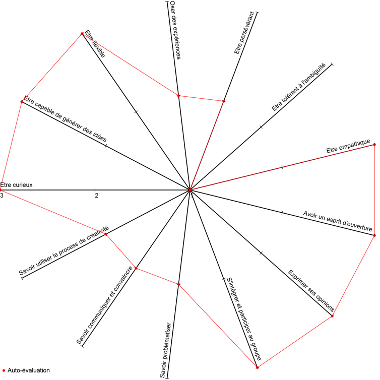 Cette auto-évaluation s’est faite en ligne sur l’outil Karuta (portefeuille de compétences en créativité).